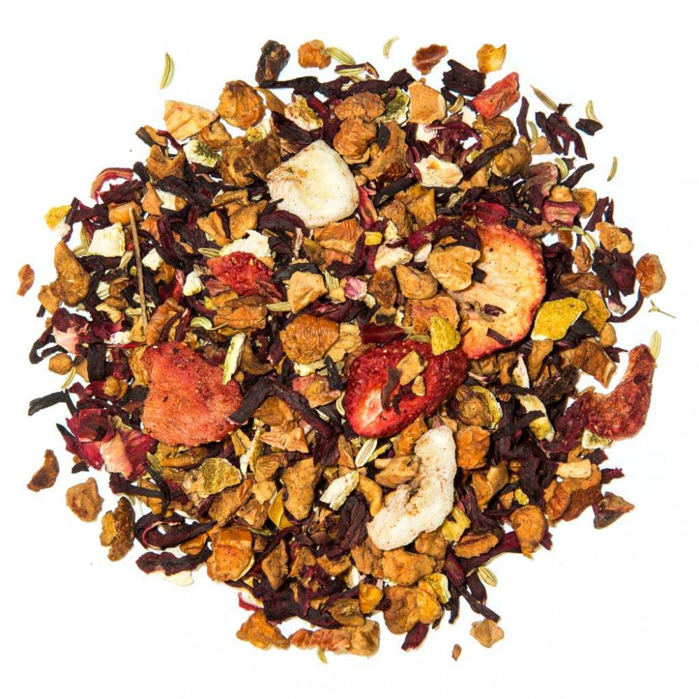 Almadarabok*, hibiszkuszvirág*, narancshéj* (10%), édeskömény*, banánchips* (banán, kókuszolaj), eperszeletek* (4%), természetes eperaroma, természetes narancsaroma